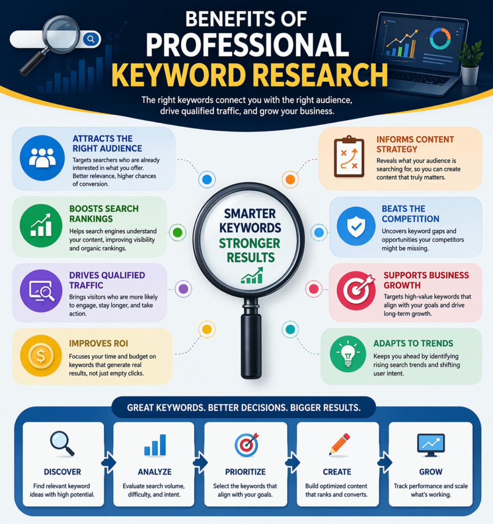 Businesses that invest in professional keyword research often see long-term SEO growth and better ROI.